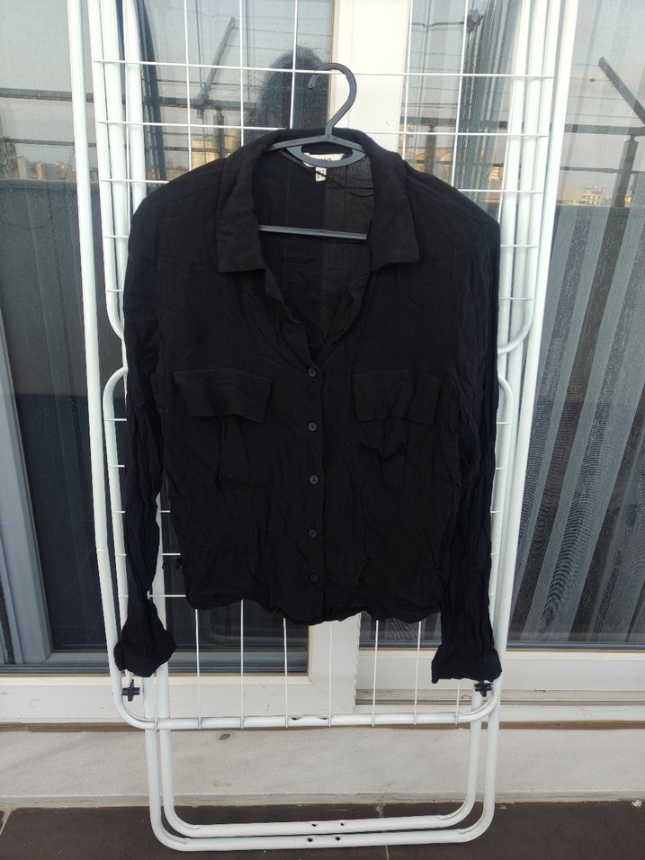 Siyah, keten kumaştan, uzun kollu, düğmeli ve yakalı, bol kesim gömlek. Gotik tarzda günlük rahat kullanım için uygundur.