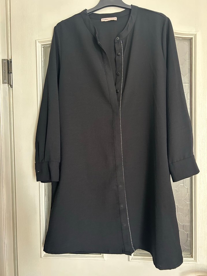 Siyah renkte, yüksek yakalı ve düğmeli ön kısmı olan uzun kollu hamile bluzudur. Normal kesim ve ipeksi dokusuyla günlük kullanıma uygundur.