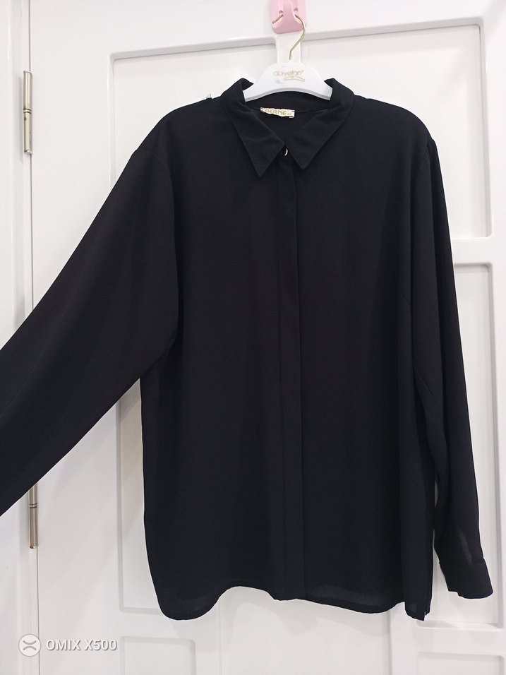Siyah, düğmeli, uzun kollu, şifon kumaş ve yakalı kadın gömleği. İpeksi dokusuyla rahat ve bol kesimdir, minimalist ve goth tarzında, ofise uygun sadece omuzunda küçük dikiş ipleri var .