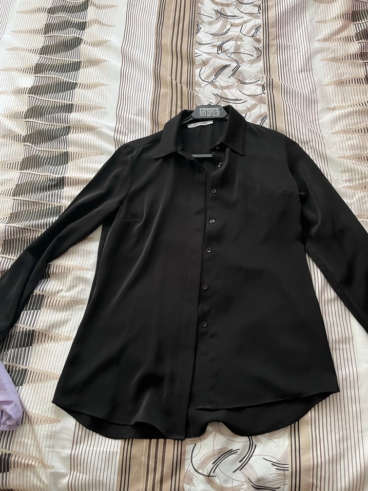Siyah, düğmeli, uzun kollu ve yakalı kadın gömleği. Orta boy, regular fit ve ofis için uygun, trend gotik tarzda. Hiç kullanılmadı. Pürüzsüz sentetik kumaştan üretilmiştir.