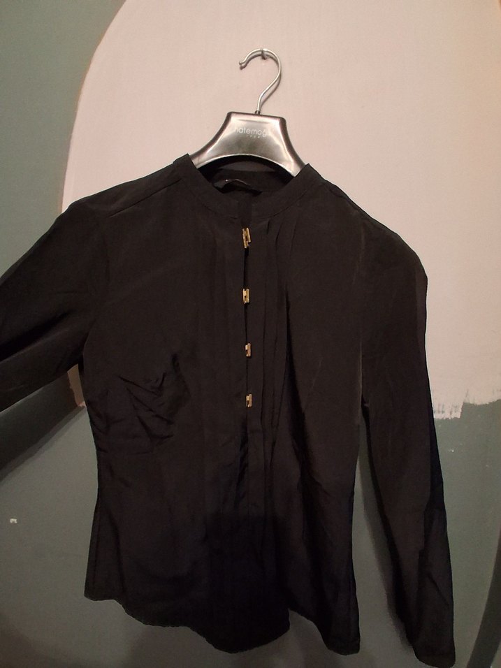 Siyah, düğmeli, notched lapel yakalı kadın gömlek. İpek gibi kumaştan, uzun kollu ve bol kesimdir. Ofis için uygun, goth ve iş tarzında.