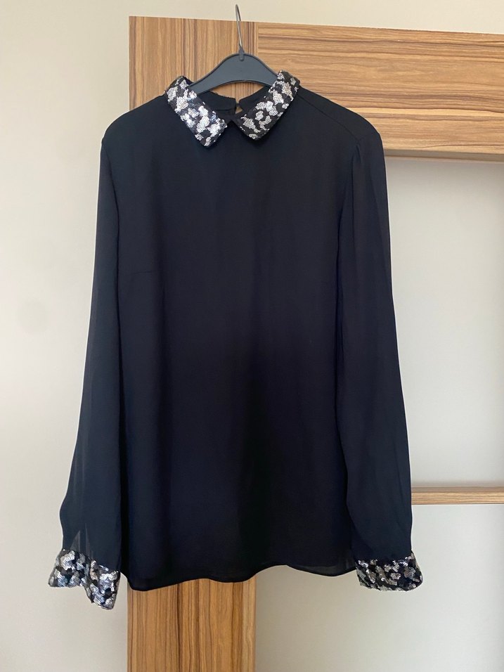 Siyah kadın gömlek, yaka ve manşetlerle düğmeli, uzun kollu ve bol kesimdir. Ofis kullanımı için uygundur.