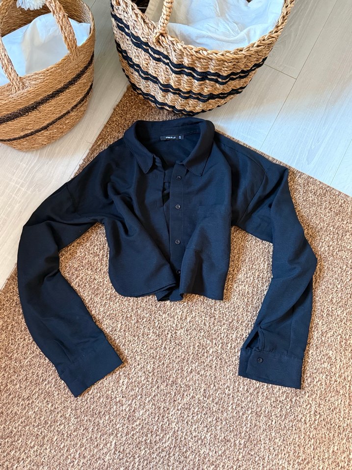 Siyah keten gömlek, uzun kollu ve düğmeli ön tasarıma sahiptir. Yakalı, midi boyda ve rahat kesimdir, günlük sokak stili için uygundur.
