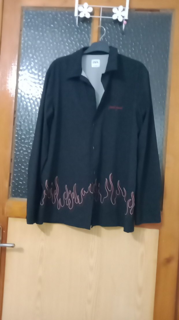 Gece siyahı, düğmeli, uzun kollu, notched lapel yakalı, rahat kesim midi gömlek. Alt kısmında alev desenleri bulunur, yumuşak ve sıcak kumaştandır.