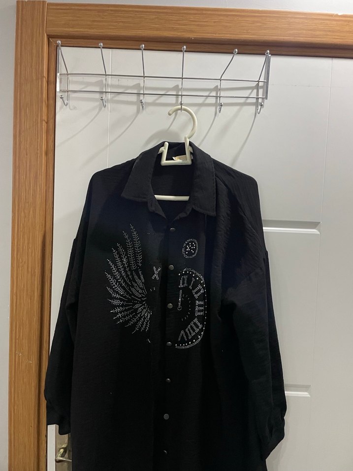 Siyah düğmeli midi gömlek, uzun kollu ve kesik yakalı. Gotik tarzda baskılı, bol kesim ve sentetik kumaştan üretilmiştir. Koli 6