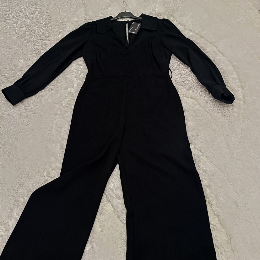 Siyah tulum, yakalı ve uzun kollu, düğmeli ön kısmı ile ofis için uygun. Rahat kesim ve uzun boy, yumuşak ve sıcak kumaştan yapılmıştır.