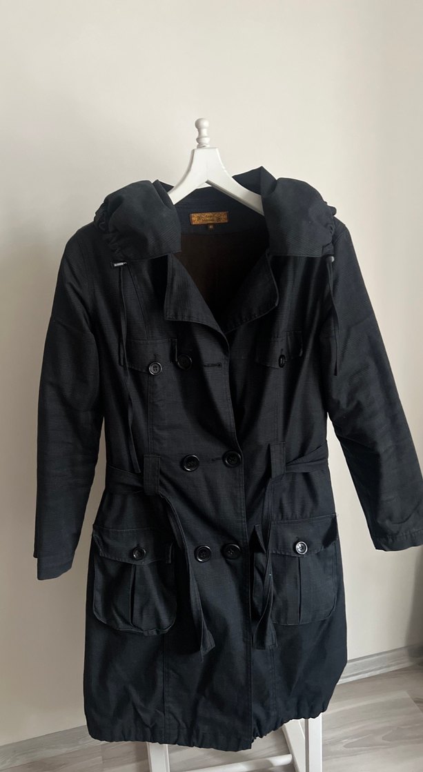 Siyah, düğmeli trençkot. Kanvas kumaştan, uzun kollu içi tasarımı miflon günlük sokak stili için uygun.