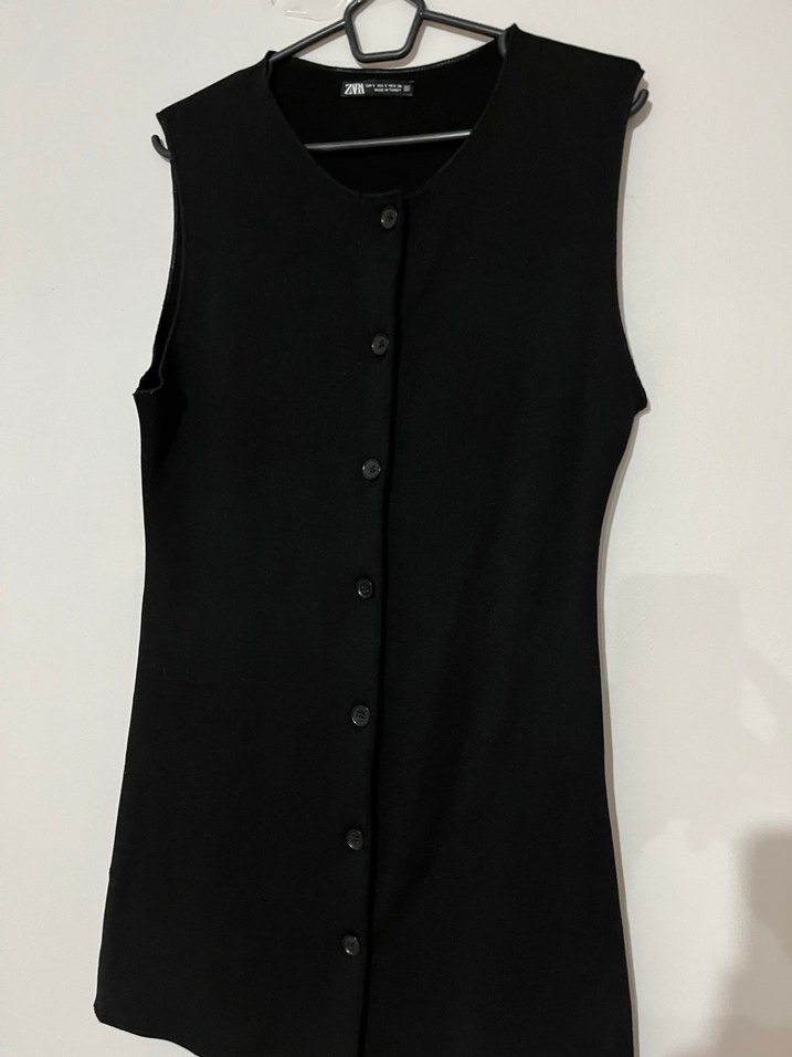 Siyah, düğmeli, V yaka ve kolsuz kadın yeleği. Midi boyda, oturan kesim ve minimalist gotik tarzda, sentetik kumaştan yapılmıştır. Günlük kullanım için uygundur.