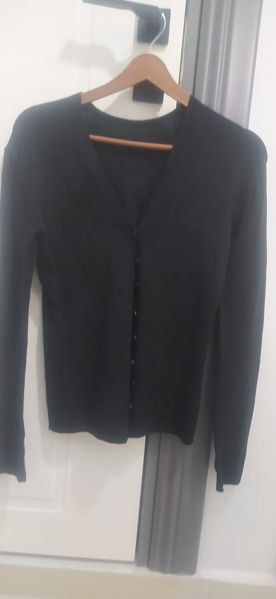 Siyah, düğmeli, uzun kollu ve V yakalı midi uzunlukta kadın hırka. Sentetik kumaştan üretilmiş, regular fit ve ofis ortamı için uygundur.