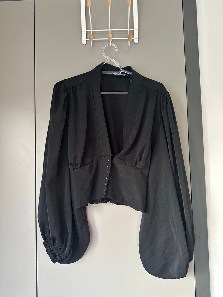 Siyah Düğmeli V Yaka Uzun Kollu Bluz