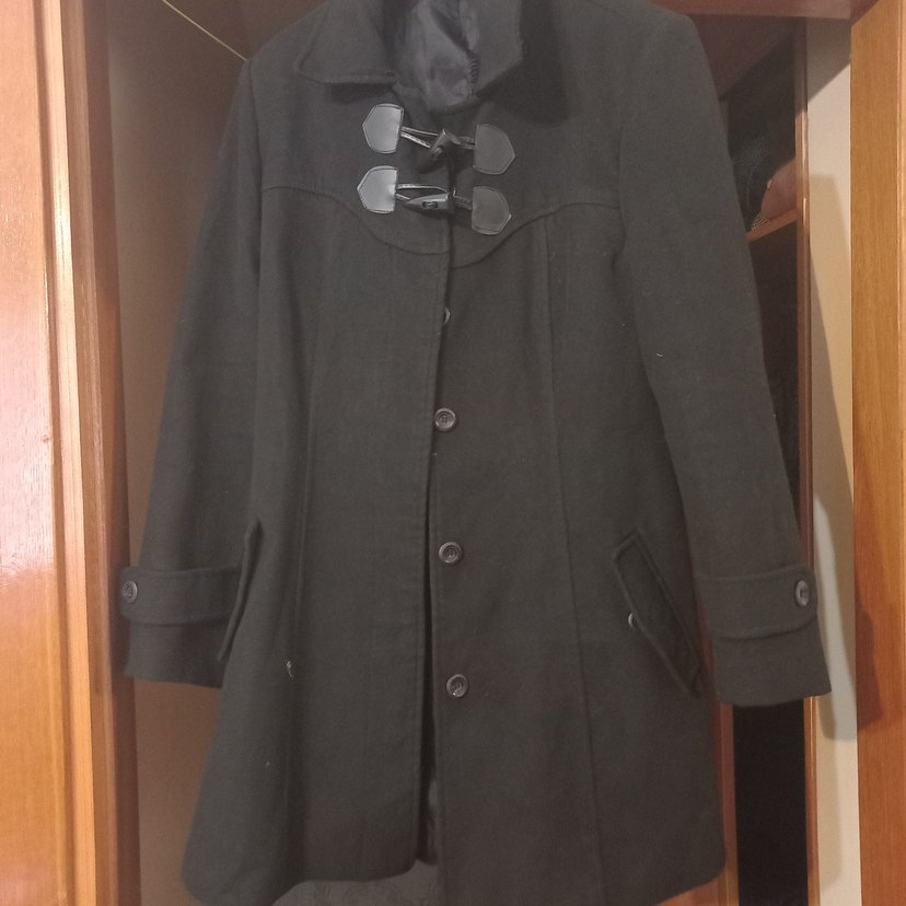 Uzun kollu, düğme ve toka detaylı siyah kaban. Yan cepleri bulunan klasik ve sıcak tasarım.