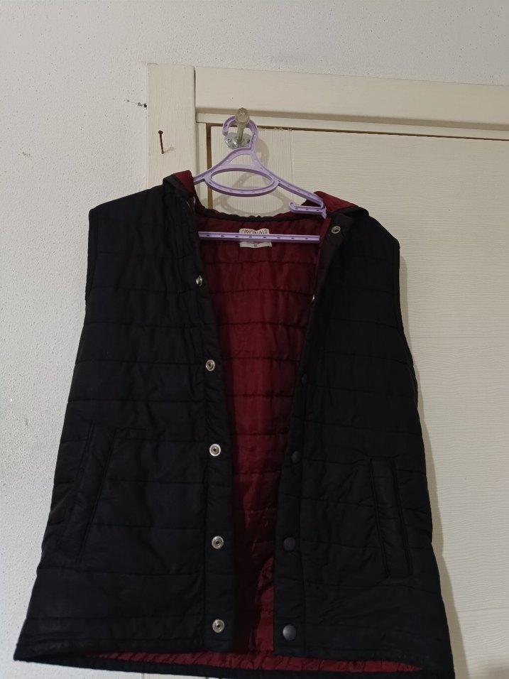 Siyah renkli, düğmeli ve yüksek yakalı kadın yelek. Sentetik kumaştan, kolsuz ve günlük kullanıma uygun, sade desensiz tasarım.