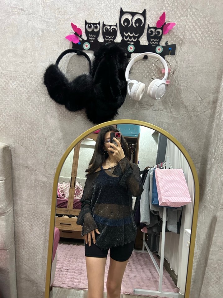 Siyah düşük omuzlu parlak tül ,bol kesim ve kısa uzunlukta triko kazak. Rahat, gotik ve rock punk