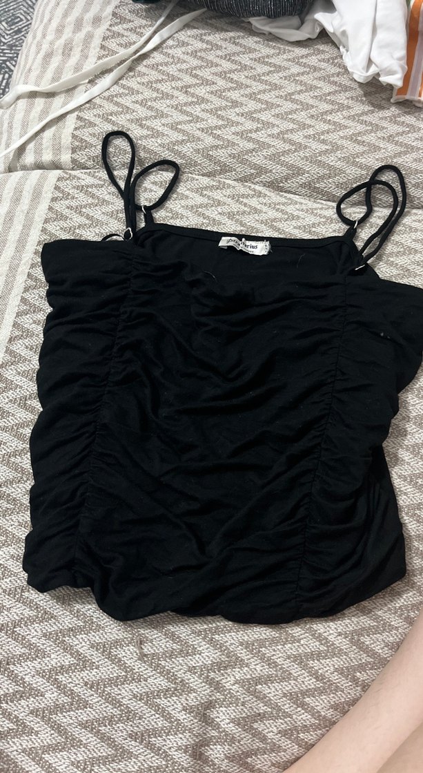 Siyah, askısız yakalı ve kolsuz, vücuda oturan crop top. Büzgülü detaylara sahiptir.