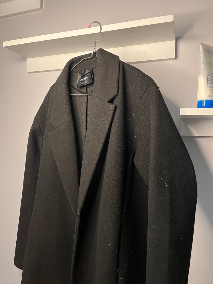 Siyah renkte, düz kesim ve klasik yakalı kalın kumaştan yapılmış kaban. Basit ve sade tasarıma sahiptir. ( kulandığım bir atkıdan dolayı tüylenme yaptı. Kedi tüyü temizlene aletiyle temizleniyor. )