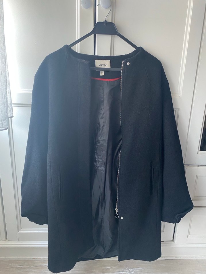 Siyah renkte, düz kesim ve astarlı kadın kaban. Önünde fermuarlı kapama ve yuvarlak yakası bulunur. Uzun kolludur ve sade bir tasarıma sahiptir.