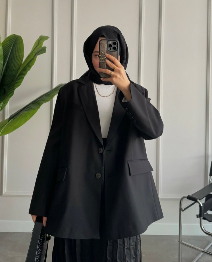 Siyah midi blazer, notched yakalı ve uzun kolludur. Düz kesimi ve sentetik kumaşıyla ofis için rahat ve şık bir tercihtir. Manken 168 58 kilo salaş kesimdir