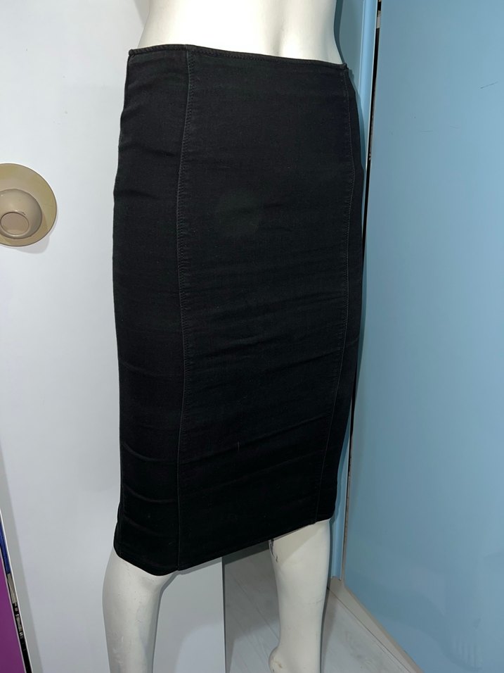 Bu dar kesim midi kalem etek, koyu siyah kot kumaştan yapılmıştır ve ofis kullanımı için cesur ve zahmetsiz şıklık sunar.