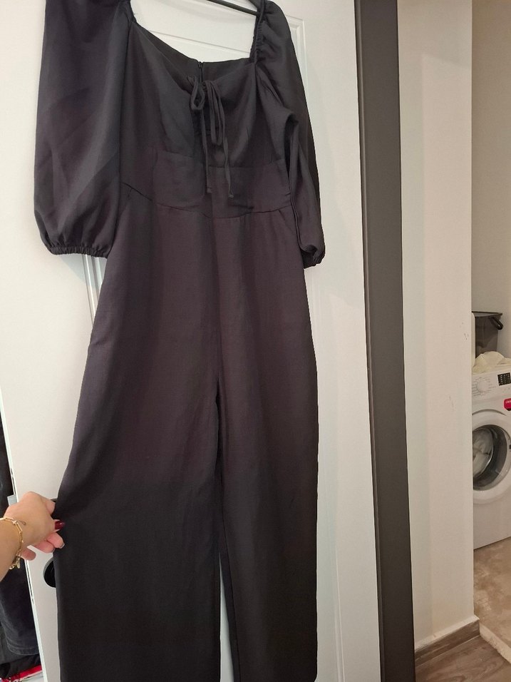 Siyah, ipli düz yakalı, askılı kollu, bol kesim ve keten kumaştan yapılmış kadın tulumu. Günlük kullanım için uygundur.