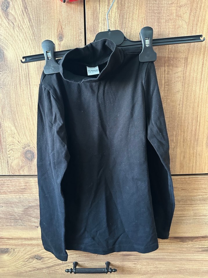 Siyah, yumuşak ve sıcak kumaştan, yüksek yakalı ve uzun kollu, çocuklar için dar kesim gömlek. Desensiz, basic ve sokak stili için uygun.