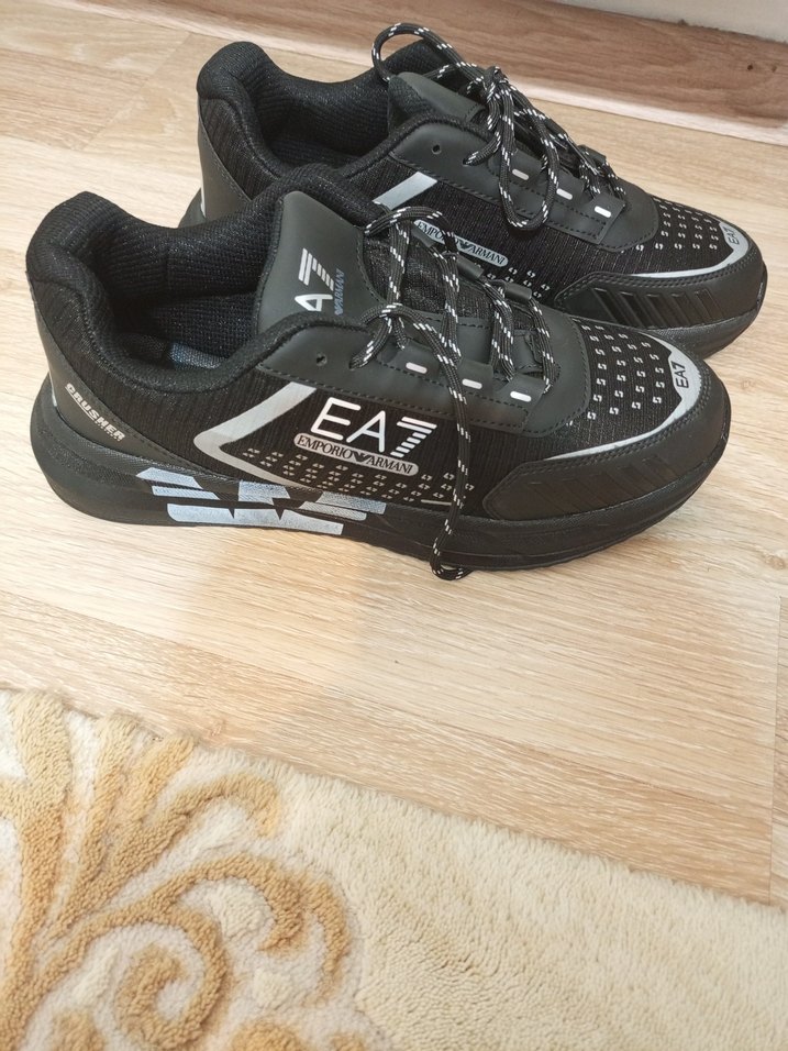 Siyah renkli EA7 erkek spor ayakkabısı, baskılı detaylı ve bağcıklı, kauçuk tabanlıdır. Trend sokak stili için uygundur.