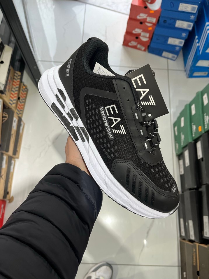 Siyah EA7 erkek spor ayakkabısı, elastik detaylı, kauçuk tabanlı ve desen içermeyen şık tasarımda, sportif sokak giyimi için uygun. 40-41-42-43-44 vardir