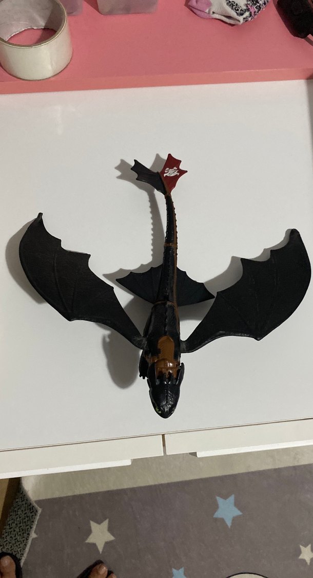 Detaylı kanatları ve kuyruğu olan siyah ejderha aksiyon figürü. Canlı koyu renklere sahip ve hareketli parçaları bulunur.