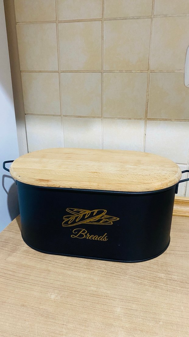 Ahşap kapaklı, yanlarında kulpları olan siyah ekmek kutusu. Önünde "Breads" yazısı bulunur.