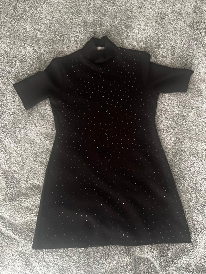 Siyah, boğazlı ve kısa kollu, vücuda oturan midi elbise. Payetlerle süslenmiş, romantik akşamlar için uygun. ✨