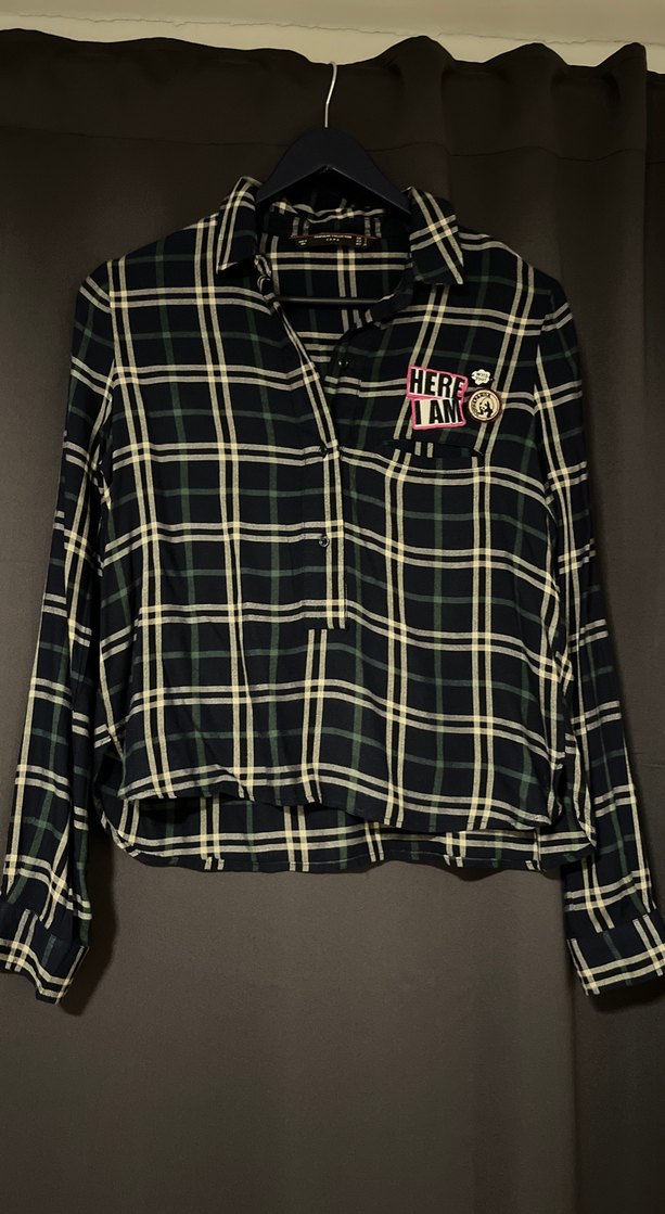 Siyah ekose desenli gömlek, yakalı ve düğmeli uzun kolludur. Bol kesimi ve göğüs kısmındaki patch detayıyla grunge punk tarzını yansıtır. Günlük kullanım için uygundur.