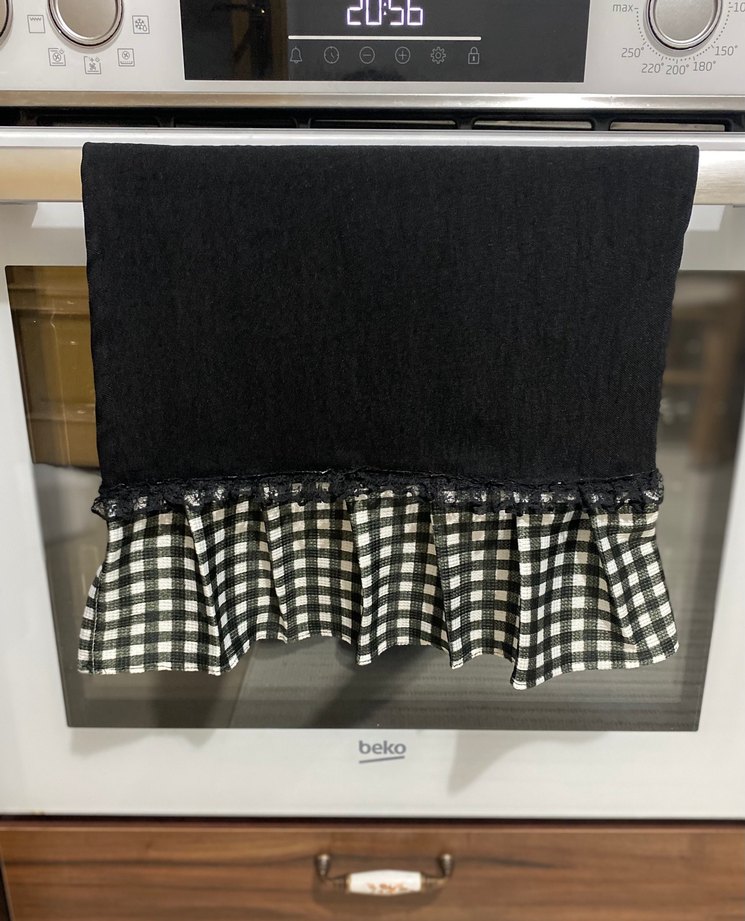 Siyah üst kısmı ve alt kısmında koyu ekose desenli fırfırı olan, dantel detaylı gotik tarzda mutfak bezi. Yumuşak kumaştan üretilmiştir.