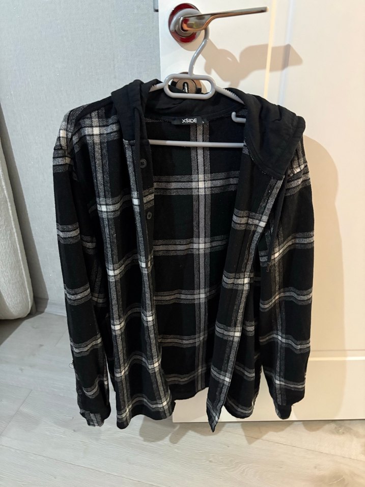 Siyah, ekose desenli, kapüşonlu, düğmeli, uzun kollu ve bol kesim kadın gömleği. Rahat ve sıcak kumaştan, günlük sokak stiline uygun.