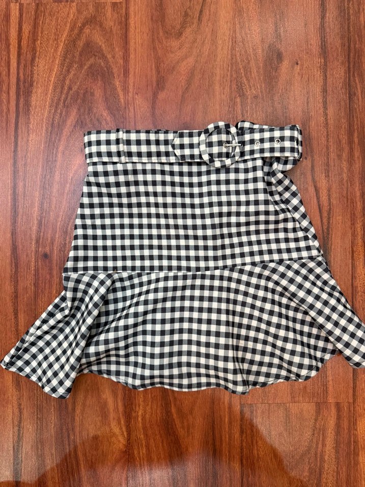 Siyah ekose desenli mini etek, bol kesim ve fırfır detaylıdır. Kemerlidir