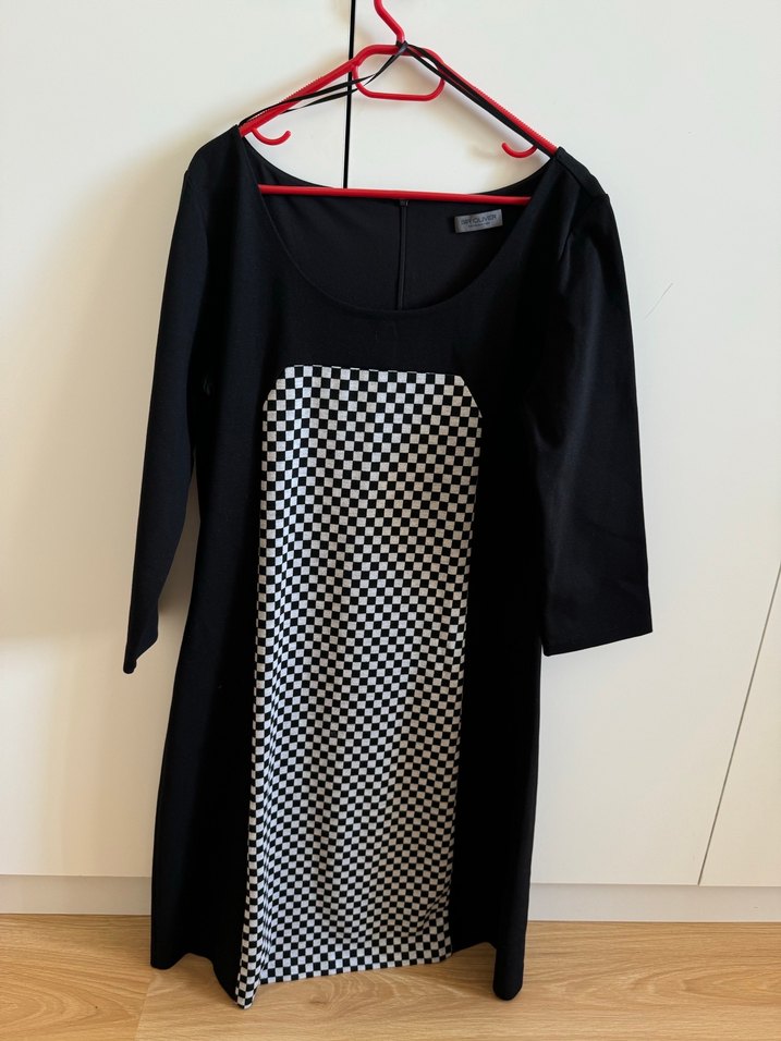 Siyah elbise , ekose desenli pileli panel, uzun kollu ve yuvarlak yakalıdır. Orta boy ve regular kesimdir, ofis için uygundur.