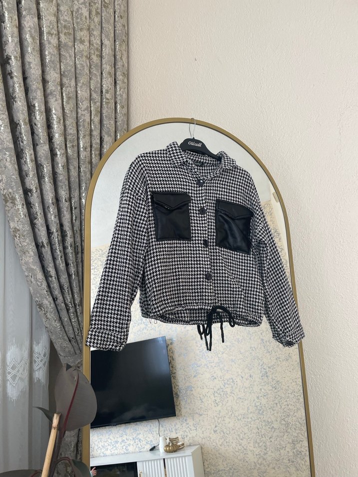 Siyah ekose desenli, düğmeli ve uzun kollu kadın gömleği. Notlu yaka ve bol kesim özelliklerine sahip, sentetik kumaştan yapılmıştır. Kısa boy ve iki siyah cep detaylıdır.
