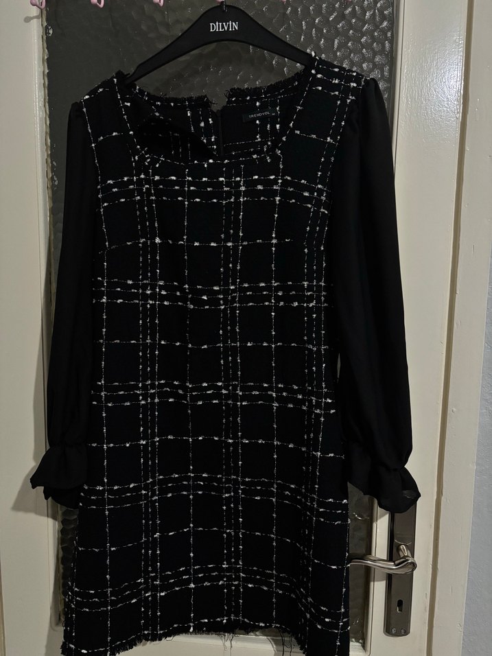 uzun kollu, U yaka siyah ekose etek. Sentetik kumaştan, TRENDYOL marka, sokak modasına uygun dar kesim. Bir kez giyildi