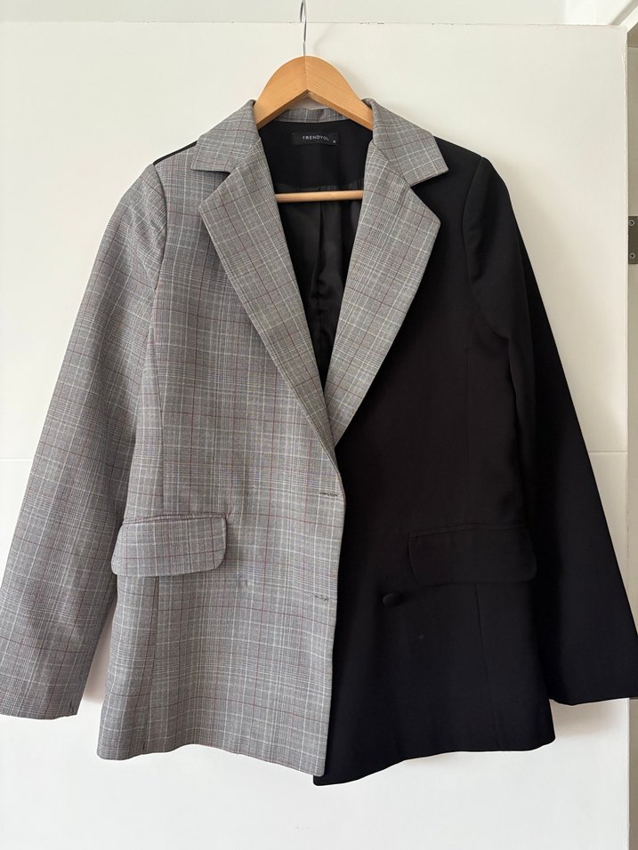 Düğmeli, normal uzunlukta kadın ceketi, gri ve siyah renklerde, düz ve kareli desenli, sentetik kumaştan, uzun kollu. Az kullanılmıştır.