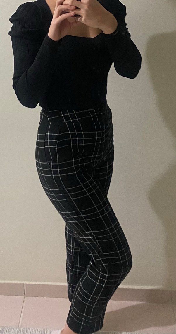 Siyah ekoseli, midi boy, kumaş pantolon. Trendy ve rahat kesimiyle günlük kullanıma uygun, şık ve rahat bir parça. 1 kez kullanıldı paçalarını kestirmiştim 168 boya görseldeki gibi oluyor fazla kısa kestirdiğim için kullanamıyorum