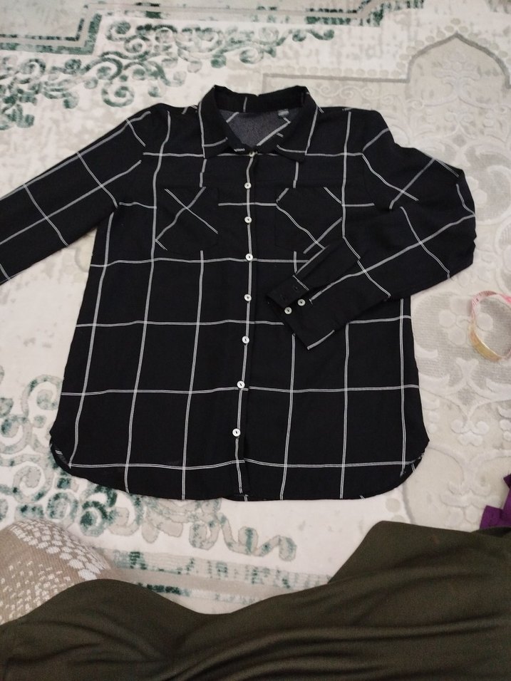 Siyah ekoseli kadın gömlek, uzun kollu, yakalı ve düğmeli. Pamuklu kumaştan, normal boyda ve rahat kesimdir. Günlük kullanıma uygundur.