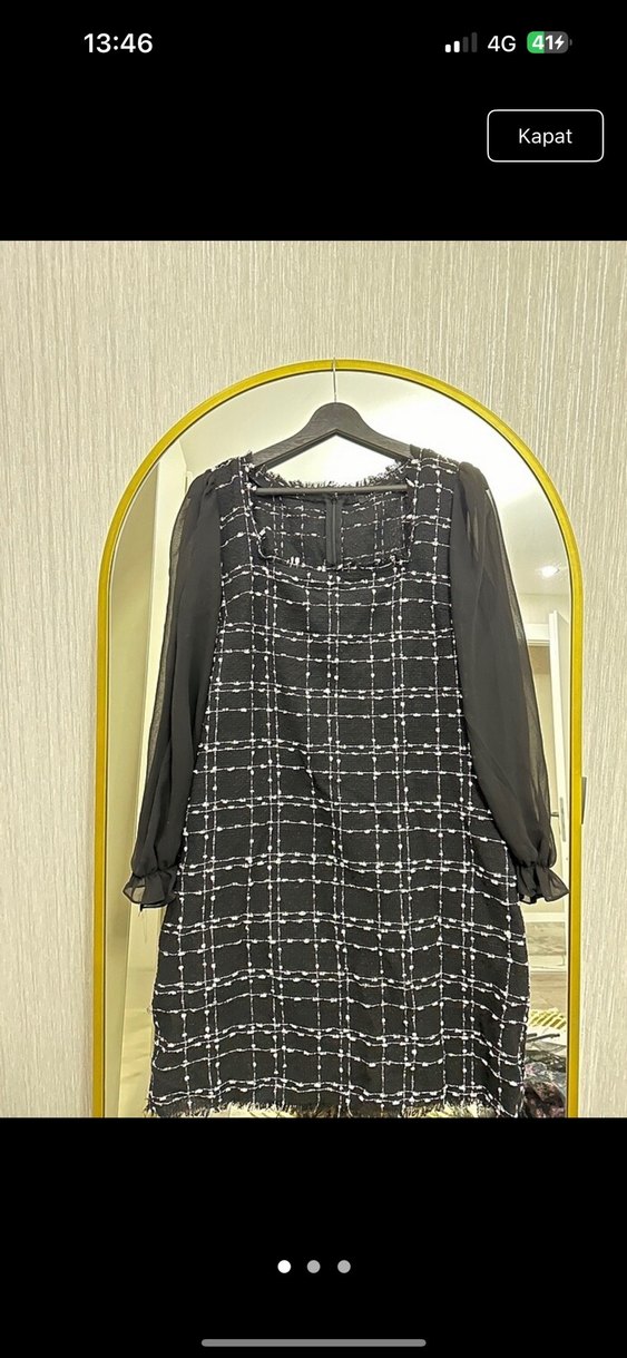 Siyah ekoseli, uzun şeffaf kollu, tekne yaka ve düğmeli detaylı bol kesim midi elbise. Günlük sokak stili için uygundur.