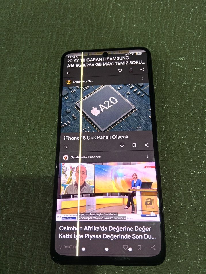 Khaki renkli Android telefon, koyu renk ekranıyla çeşitli haber içeriklerini gösteriyor. 128GB depolama ve net görüntü sunar.