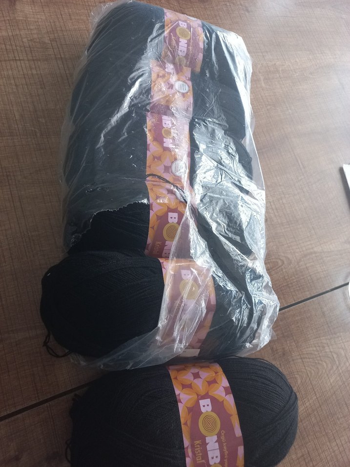 Üç top siyah el işi ipliği, plastik ambalaj içinde. Örgü ve tığ işleri için uygundur.