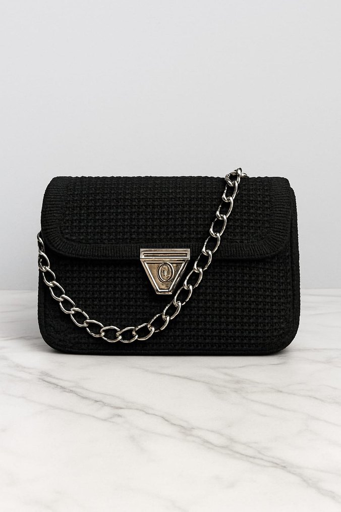 Siyah örgü kemerli tasarıma ve parlak görünüme sahip kadın çantası. Zincir askılı ve modern klasik stilde, günlük kullanım için uygundur. el örgüsüdür kişiye özel istenilen renklerde yapılır..