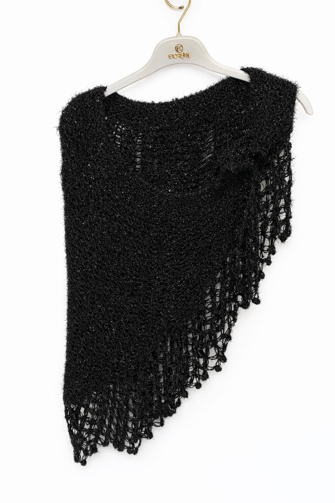 Asimetrik kesim ve püsküllü kenarları olan siyah örgü kadın panço, gotik ve avant-garde tarz için uygun. El emeği hiç kullanılmamıştır.