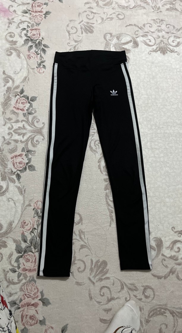 Siyah renk, elastik bel bantlı ve yanları beyaz şeritli, sentetik kumaştan yapılmış, spor ve günlük kullanım için uygun tayt.