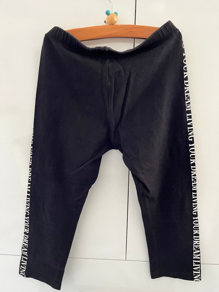 Siyah, elastik bel bantlı, diz altı uzunluğunda tayt. Yumuşak kumaştan, yanlarda beyaz yazı detaylı, sokak stili için uygun.