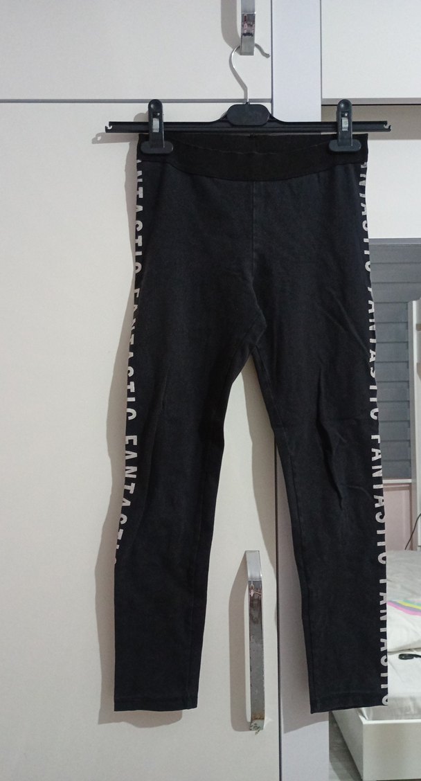 Elastik bel bantlı, esnek siyah denim kumaştan, yanlarında gri yazı detaylı, günlük kullanıma uygun dar kesim tayt. yanı 'fantastic' yazılı. sadece son fotoğrafta çektiğim kızsın çok küçük delik ama çok küçük yani alan kişi iple diker diye düşündüm çünkü kumaşı kaliteli bir tayt. zaten bu kusuru fiyata yansıtacağım.