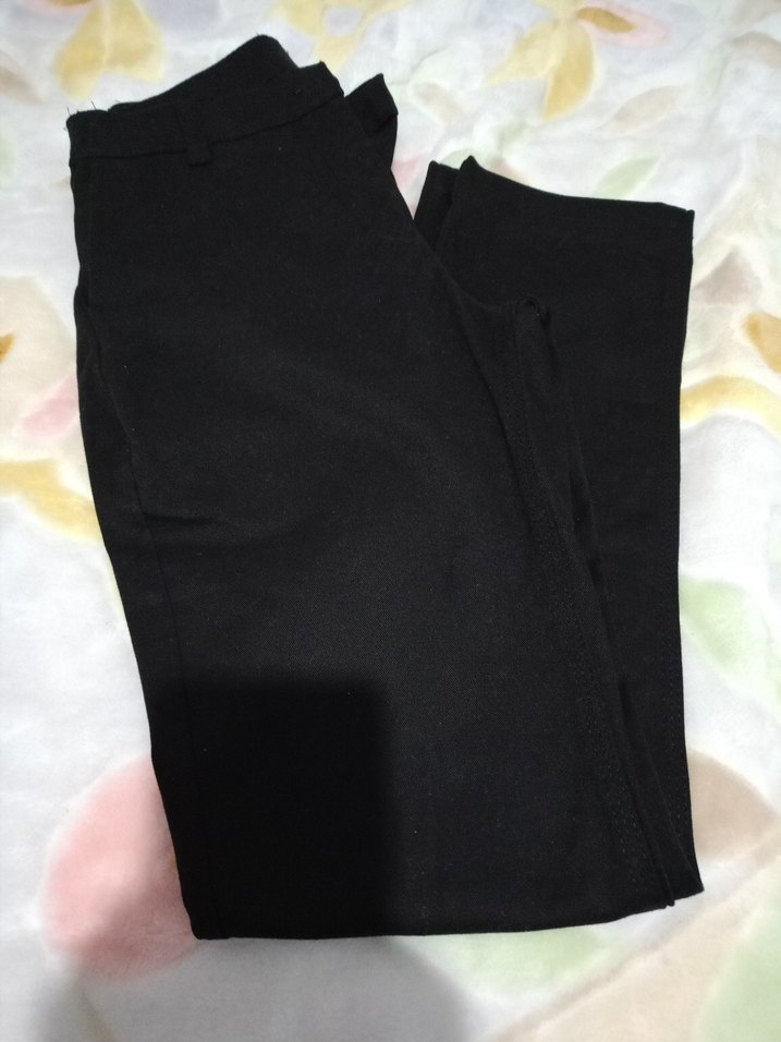 Siyah, elastik bel bantlı, midi boy, regular fit kadın kumaş pantolon. Günlük rahat sokak stili için uygundur.