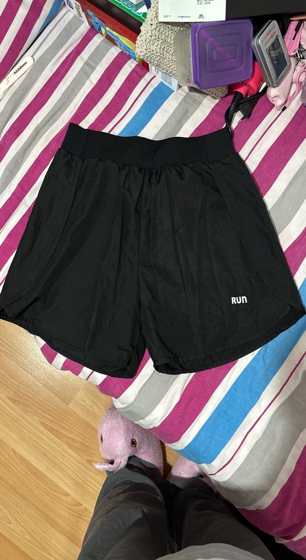 Siyah renkli, elastik bel bantlı, bol kesim kadın mini şort. Sentetik kumaştan üretilmiş, üzerinde "RUN" yazısı bulunur. Spor ve günlük kullanıma uygun. ♀️