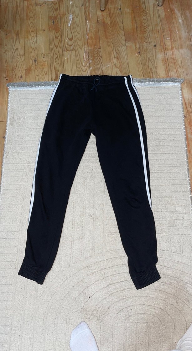 Elastik bel ve bilek lastiği bulunan, yumuşak ve sıcak kumaştan yapılmış siyah, fitted kesim eşofman altı. Beyaz yan çizgileri vardır, dış mekan kullanımı için uygundur. Rengi